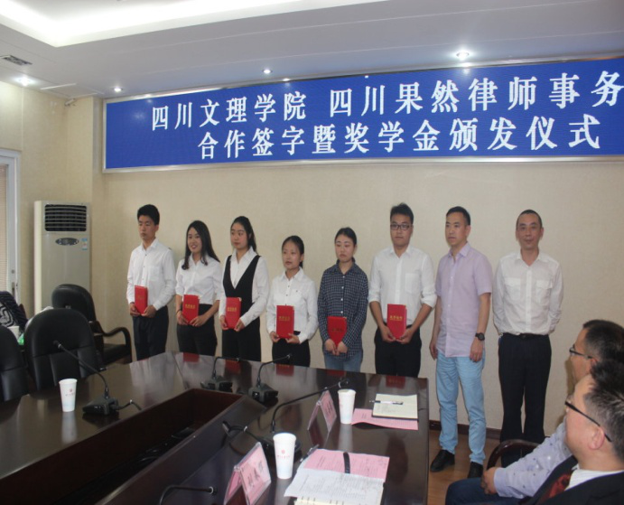 接下来,邓杰处长和田金陇主任分别代表双方签署校企合作协议。王成端书记代表学校向四川果然律师事务所授“beat365英国官方网站教育教学实践基地”牌匾。然后,邓杰处长宣读了2017-2018学年“果然奖学金”获奖名单,李魏、王顺平、何秀霞、王潇、任静欢、王川江等6名同学分别获得一二三等奖学金。朱世健和周健主任代表果然律师事务所向获奖学生颁奖。之后,李魏代表获奖学生发言,他首先对学校和四川果然律师事务所的培养与关心表示由衷感谢,他介绍了自己在文理学院的成长经历以及在律师事务所见习的收获,并誓言将荣誉化作动力,今后更加努力地学习和工作。