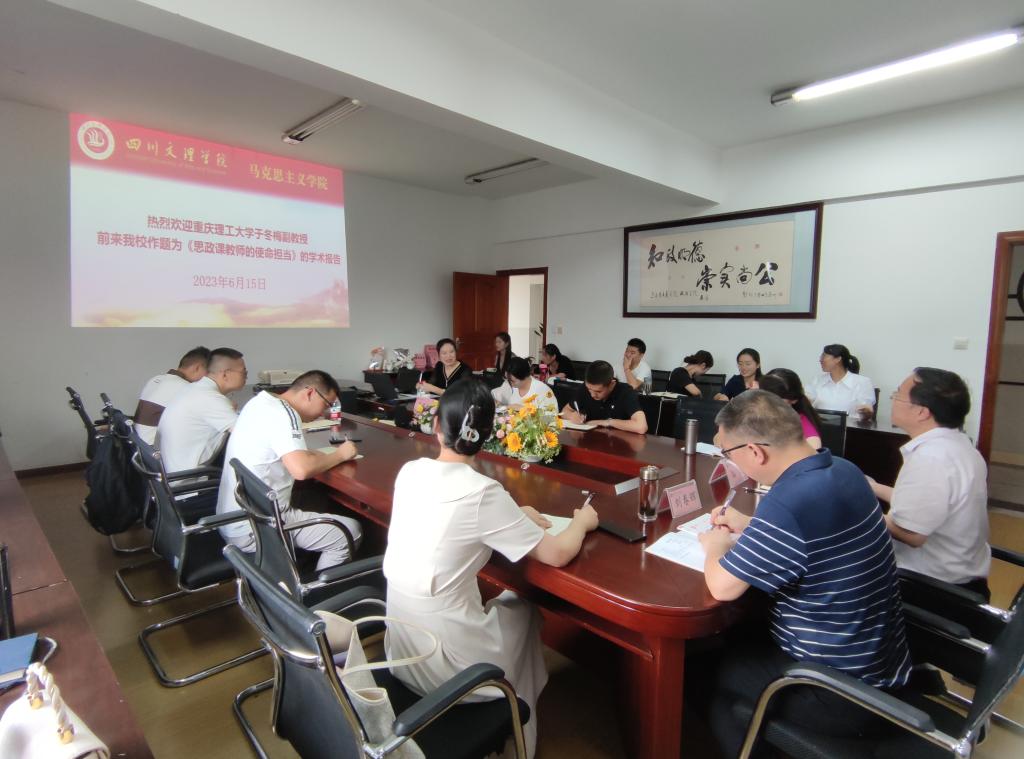 6月15日,重庆理工大学于冬梅副教授应邀在我校博文楼611会议室作题为《思政课教师的使命担当》的学术报告。beat365英国官方网站院长孙杰主持,beat365英国官方网站党委书记刘春辉及全院教师参会。
