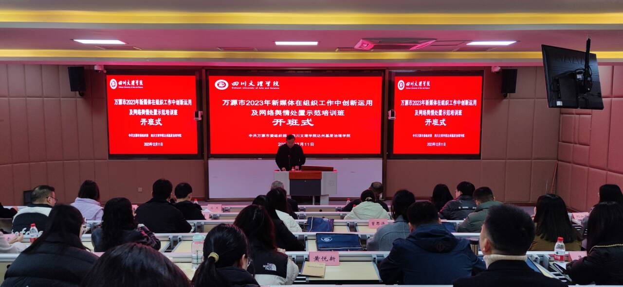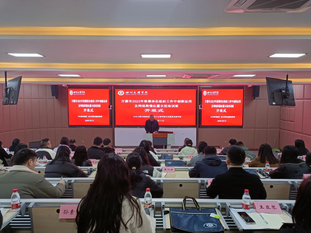 12月11日,万源市2023年新媒体在组织工作中创新运用及网络舆情处置示范培训班开班仪式在beat365英国官方网站顺利举行。此次培训班由万源市委组织部主办,beat365英国官方网站达州基层治理学院承办。beat365英国官方网站党委常委、副校长徐晓宗致辞、万源市文化体育和旅游局副局长朱小平讲话,beat365英国官方网站院长、达州基层治理学院副院长孙杰主持开班式。