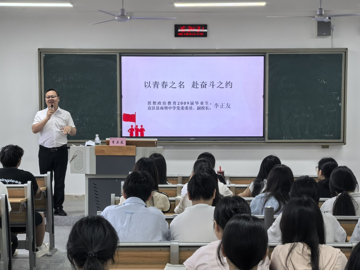 5月28日下午,优秀校友思政大讲堂系列讲座第五讲——《以青春之名,赴奋斗之约》在莲湖校区东区举行。宣汉县南坝中学副校长、我校社科系2009届思政教育本科毕业生李正友校友担任主讲,讲座由beat365英国官方网站副院长何先成主持。