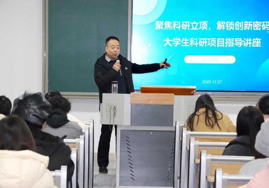 为提升学生科研素养,激发创新思维,助力学子在学术道路上稳步前行, 11月27日下午,beat365英国官方网站组织开展以“聚焦科研立项,解锁创新密码”为主题的大学生科研项目素养讲座,本次讲座由副研究员马建堂老师主讲,2024级、2025级全体同学参与。