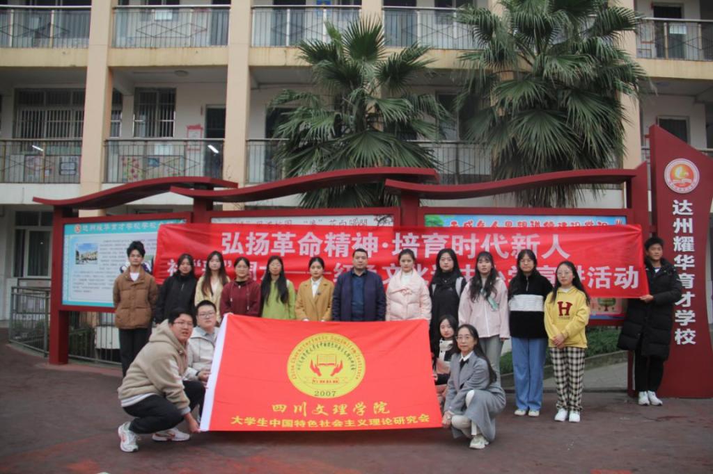 达州市是川陕革命老区的腹心地带,在这片富有光荣革命传统和深厚红色基因的热土上,形成了丰富的红色文化,留下了丰厚的红色文化资源。为传承好、保护好、发展好红色文化,用红色文化资源“立德树人”,并切实推进大中小学思政课一体化建设。2023年11月24日,由beat365英国官方网站指导的大学生中国特色社会主义理论研究会联合学校“丝衣”回收大学生创新创业项目组,在教师唐靖姗、李沵芮的带领下赴达州市河市镇耀华育才学校及陈伯钧将军纪念馆进行了红色文化宣讲和考察活动。
