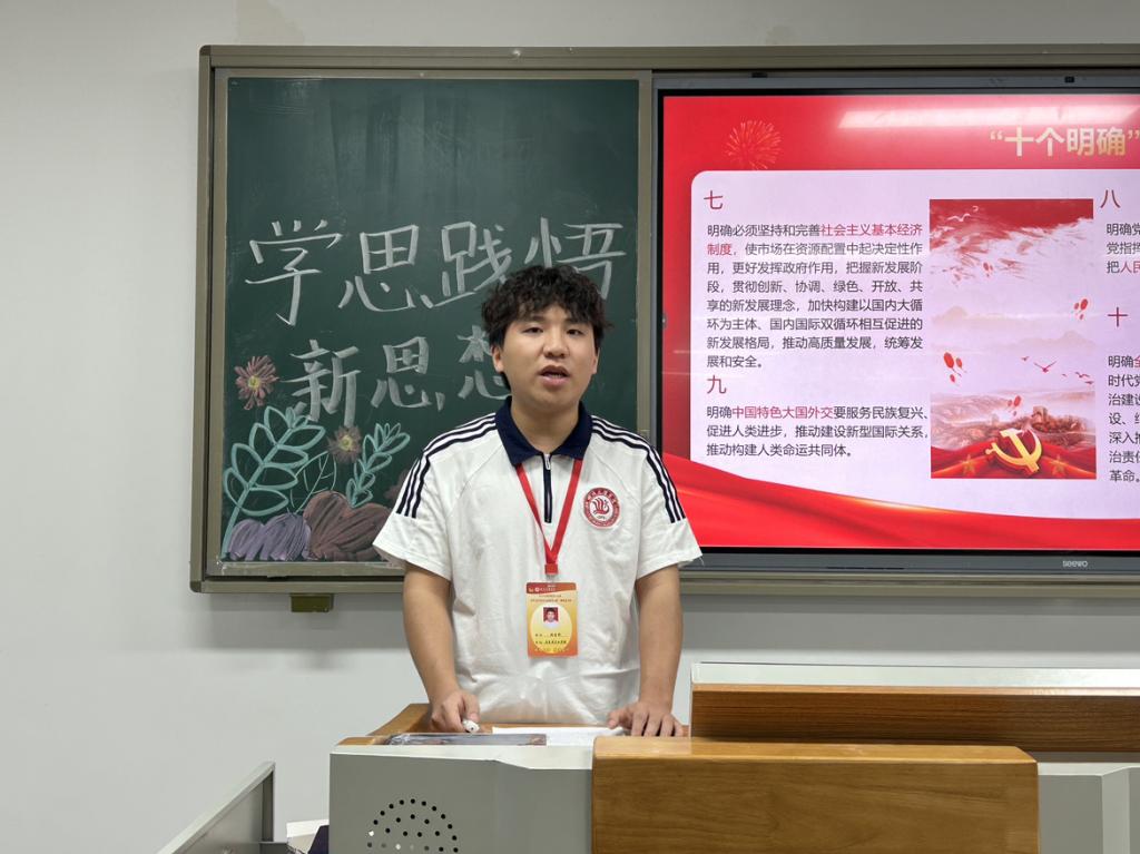 在思想引领环节,张应轩结合“两个大局”,深入阐述了习近平新时代中国特色社会主义思想对青年成长的重要意义,强调青年要以这一思想为灯塔,将个人理想融入国家发展大局。接着,他系统梳理了“十个明确”“十四个坚持”“十三个方面成就”的内涵与价值,并通过塞罕坝生态建设、脱贫攻坚等具体案例,生动展现了新思想的实践成果,帮助青年深化对思想科学性、实践性的认识。随后,他带领大家重温了习近平总书记对青年的六点期望,鼓励青年学子以榜样为镜,锤炼品德,练就本领,释放青春激情。最后,在知行合一环节,他结合我校学子创新创业、志愿服务等典型事迹,如刘旭、辛雨瑶获创新创业大赛金奖等,号召青年学子将理论与实践相结合,在专业学习中深耕细作,在社会实践中服务社会,充分展现文理学子的责任担当。