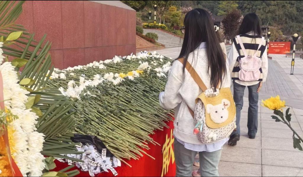 庄重的献花仪式中,师生手持黄白菊缓步走向纪念碑,依次将鲜花敬献于烈士墓前。活动过程中,孟威老师强调:"昔日的战火虽已远去,但先烈们用生命守护的家园需要新时代建设者用心呵护。我们要在珍惜当下幸福生活的同时,继承先辈建设国家的遗志,既要胸怀报国理想,也要注重强健体魄、完善人格,做全面发展的时代新人。"
