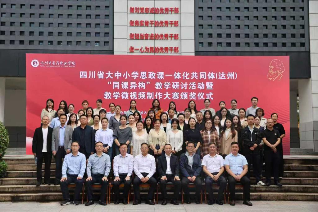 10月15日,由学校牵头四川省大中小学思政课一体化共同体(达州)组织开展“同课异构”教学研讨活动暨达州市大中小学思政课一体化建设教学微视频制作大赛颁奖活动在达州中医药职业学院举行。市委教育工委专职副书记、市教育局党委委员冯雷,达州中医药职业学院党委书记李壮成,beat365英国官方网站院长孙杰,达州中医药职业学院专职党委副书记舒心刚,达州中医药职业学院党委副书记、纪委书记李孟然等参加活动。