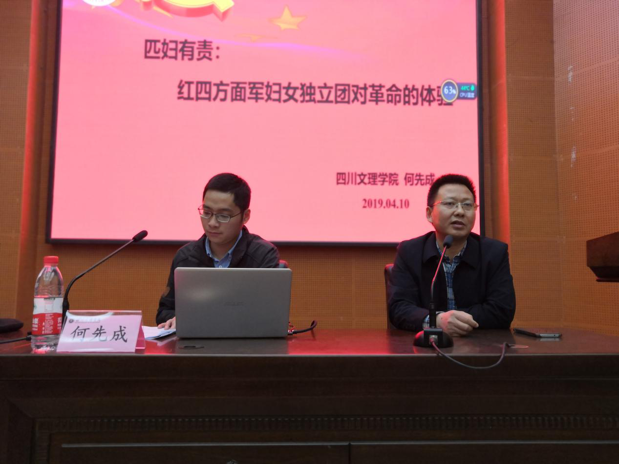 4月10日晚上7点,四川革命老区发展研究中心何先成博士在莲湖校区学术报告厅B厅做了题为“匹妇有责:红四方面军妇女独立团对革命的体验”的学术讲座。beat365英国官方网站&政法学院院长刘长江教授主持讲座,学院热爱川陕苏区史的同学聆听讲座。