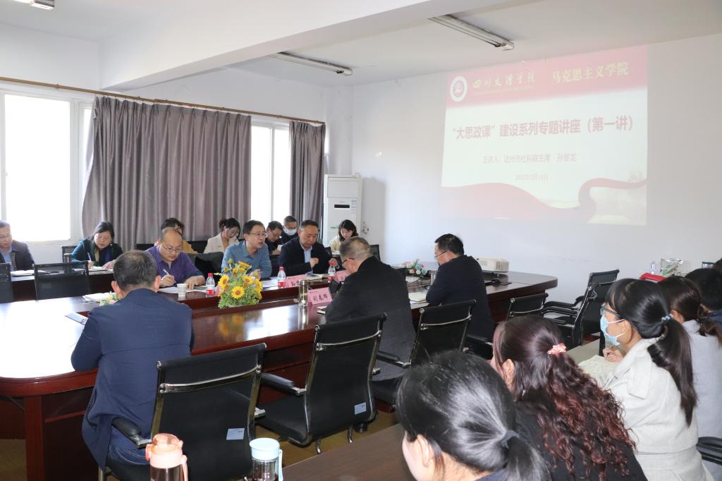 为深入学习贯彻党的二十大精神和习近平总书记关于加强“大思政课”建设的指示精神,进一步推动beat365英国官方网站内涵式高质量发展,3月14日,beat365官网邀请达州市社科联孙黎龙主席来beat365官网作“坚持马克思主义在意识形态领域的指导地位,积极推动哲学社会科学研究工作”的专题报告,学校党委常委、组织部部长涂德祥,科技处处长周頔出席。座谈会由院长孙杰主持,全院教师参加座谈会。