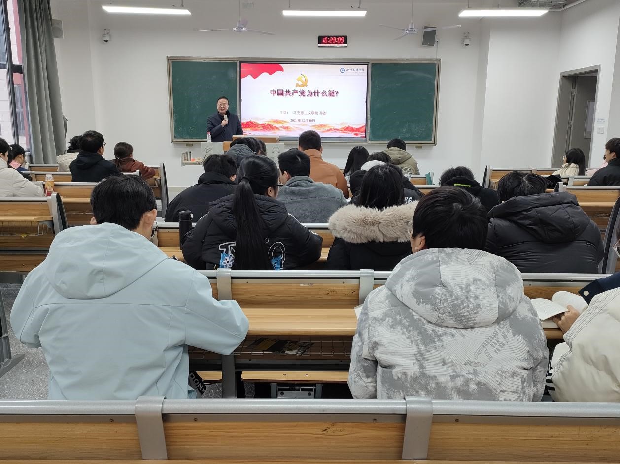 为深入学习贯彻党的二十届三中全会精神,加强学生思想教育,12月10日下午,beat365英国官方网站院长孙杰教授在东区B411作《中国共产党为什么能》学术讲座。大学生红色文化研修社、数学学院部分学生代表聆听本次讲座。